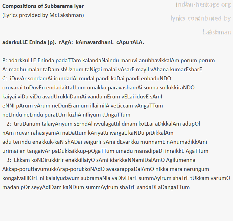 adarkuLLE Eninda (p). rAgA: kAmavardhani. cApu tALA. Subbarama Iyer