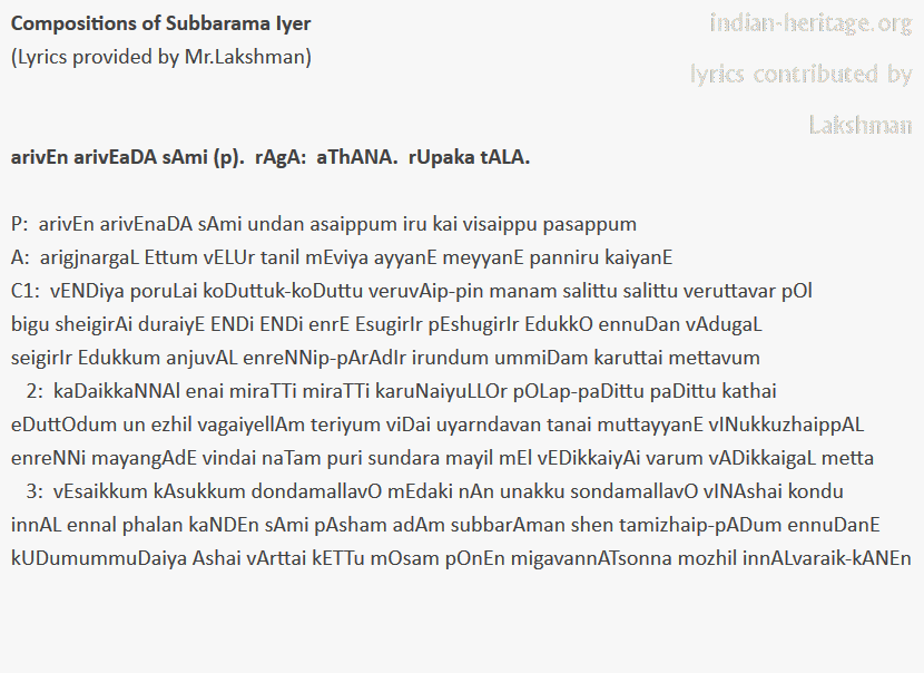 arivEn arivEaDA sAmi (p). rAgA: aThANA. rUpaka tALA. Subbarama Iyer.