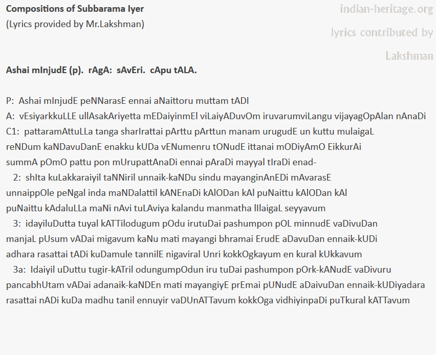 Ashai mInjudE (p). rAgA: sAvEri. cApu tALA. Subbarama Iyer.