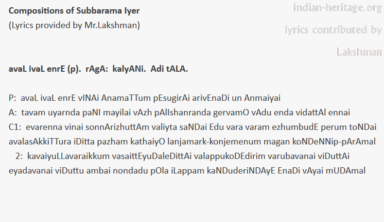 avaL ivaL enrE (p). rAgA: kalyANi. Adi tALA. Subbarama Iyer.