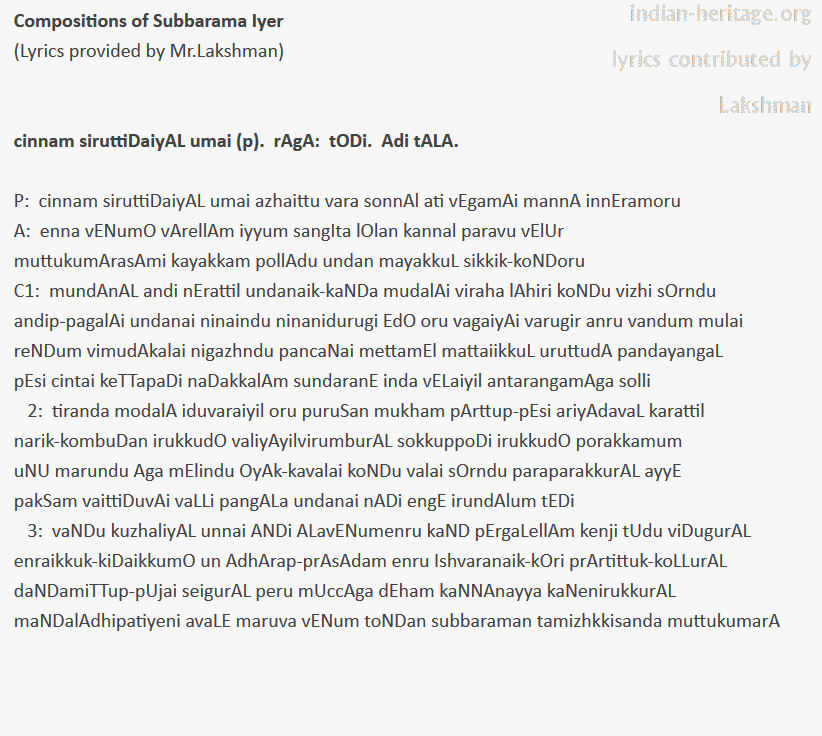 cinnam siruttiDaiyAL umai (p). rAgA: tODi. Adi tALA. Subbarama Iyer.