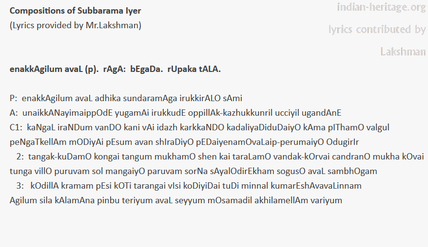 enakkAgilum avaL (p). rAgA: bEgaDa. rUpaka tALA. Subbarama Iyer.