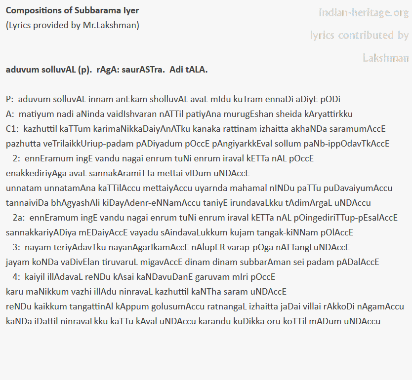 aduvum solluvAL (p). rAgA: saurASTra. Adi tALA. Subbarama Iyer.
