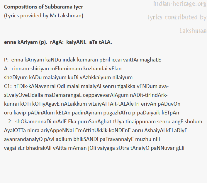 enna kAriyam (p). rAgA: kalyANi. aTa tALA. Subbarama Iyer.