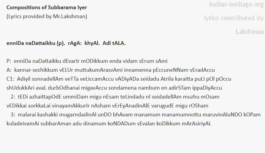 enniDa naDattaikku (p). rAgA: khyAl. Adi tALA. Subbarama Iyer.