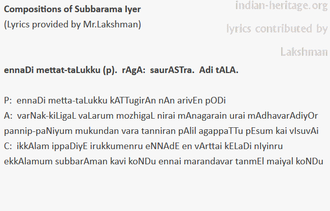 ennaDi mettat-taLukku (p). rAgA: saurASTra. Adi tALA. Subbarama Iyer.