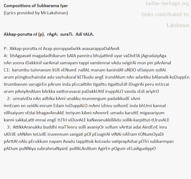Akkap-porutta nI (p). rAgA: suraTi. Adi tALA. Subbarama Iyer.