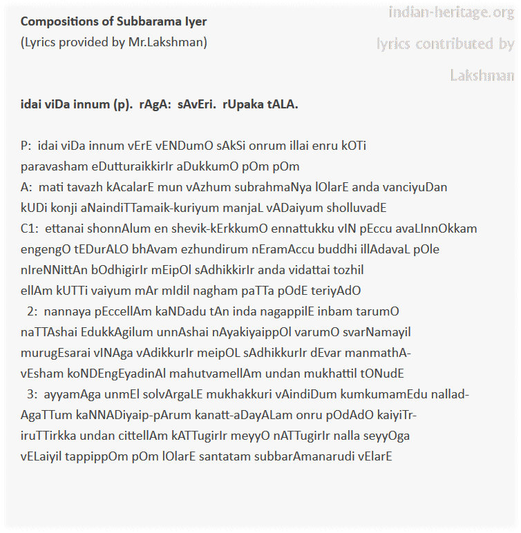 idai viDa innum (p). rAgA: sAvEri. rUpaka tALA. Subbarama Iyer.