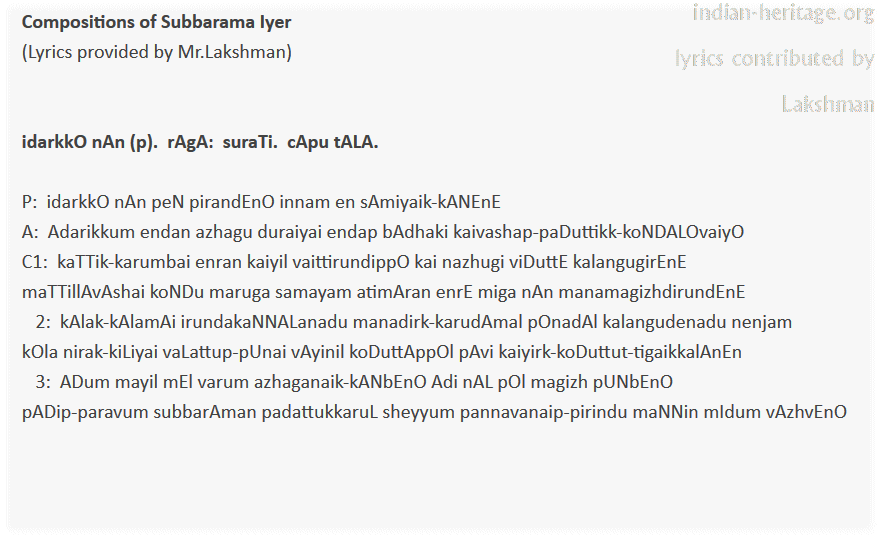 idarkkO nAn (p). rAgA: suraTi. cApu tALA. Subbarama Iyer.
