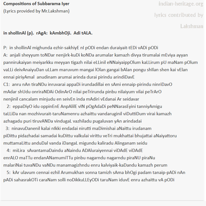 in shollinAl (p). rAgA: kAmbhOji. Adi tALA. Subbarama Iyer.