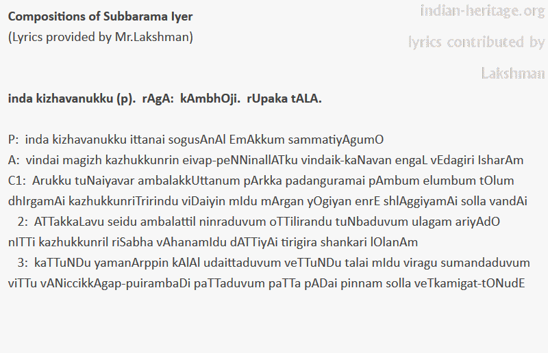 inda kizhavanukku (p). rAgA: kAmbhOji. rUpaka tALA. Subbarama Iyer.