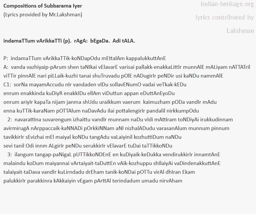 indamaTTum vArikkaTTi (p). rAgA: bEgaDa. Adi tALA. Subbarama Iyer.