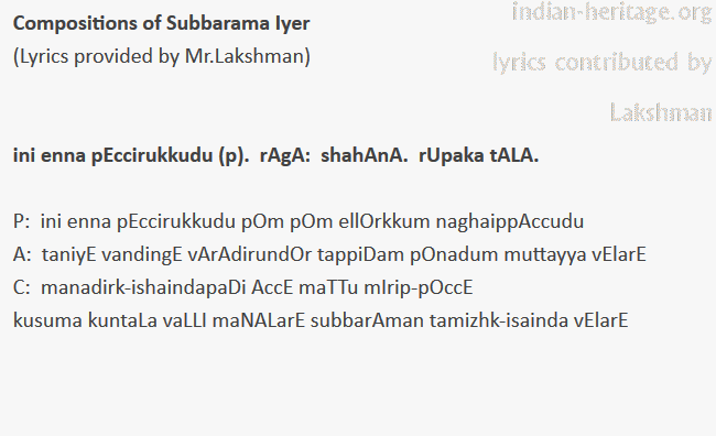 ini enna pEccirukkudu (p). rAgA: shahAnA. rUpaka tALA. Subbarama Iyer.