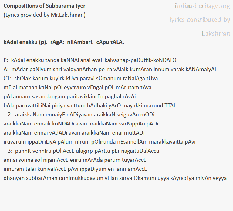 kAdal enakku (p). rAgA: nIlAmbari. cApu tALA. Subbarama Iyer.