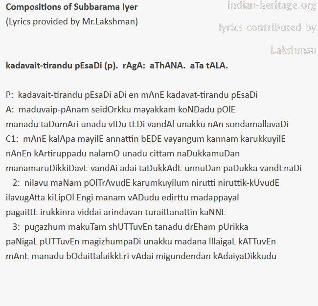 kadavait-tirandu pEsaDi (p). rAgA: aThANA. aTa tALA. Subbarama Iyer.