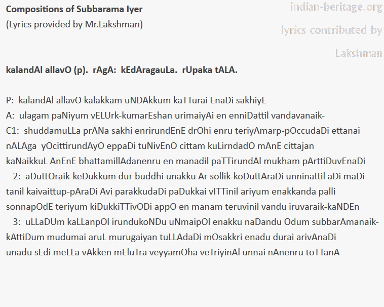 kalandAl allavO (p). rAgA: kEdAragauLa. rUpaka tALA. Subbarama Iyer.