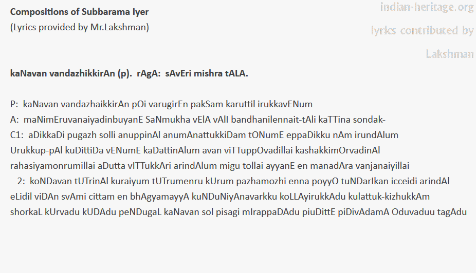 kaNavan vandazhikkirAn (p). rAgA: sAvEri mishra tALA. Subbarama Iyer.
