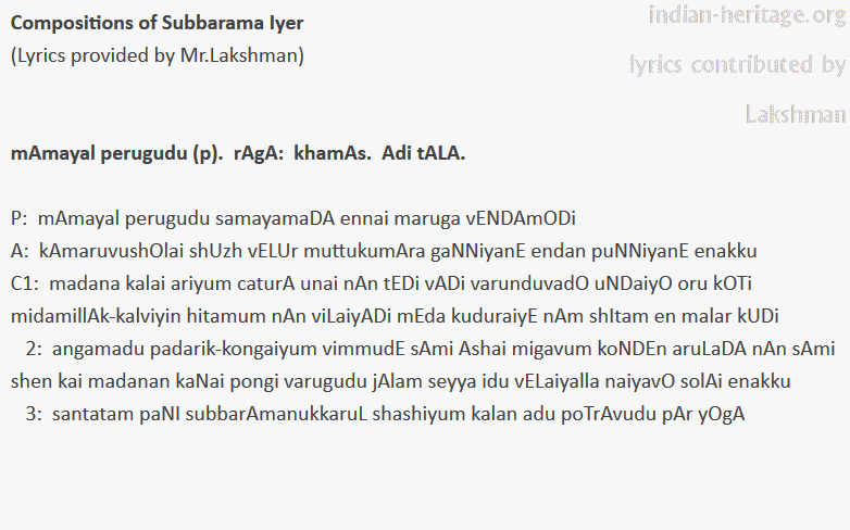 mAmayal perugudu (p). rAgA: khamAs. Adi tALA. Subbarama Iyer.