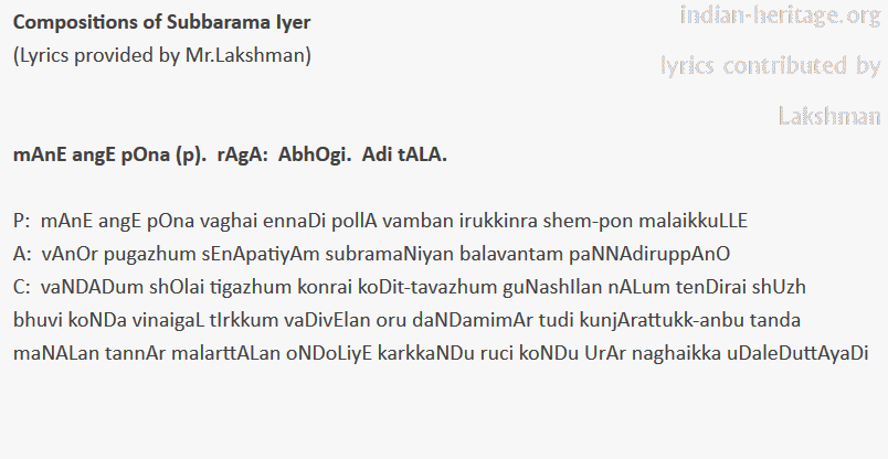 mAnE angE pOna (p). rAgA: AbhOgi. Adi tALA. Subbarama Iyer.