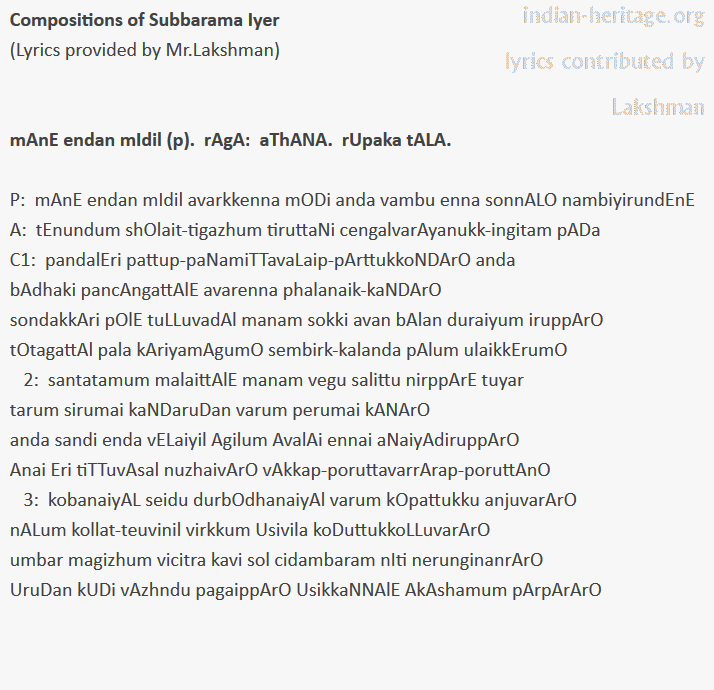 mAnE endan mIdil (p). rAgA: aThANA. rUpaka tALA. Subbarama Iyer.