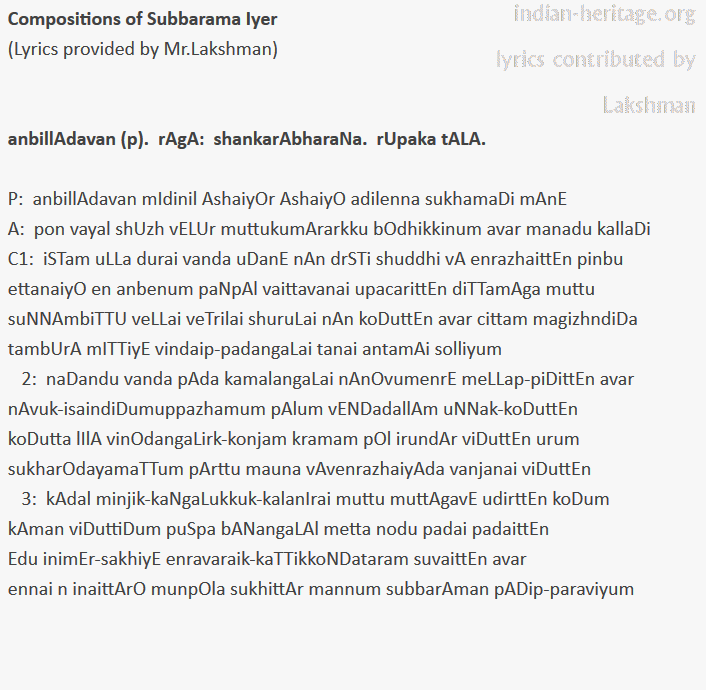 anbillAdavan (p). rAgA: shankarAbharaNa. rUpaka tALA. Subbarama Iyer.