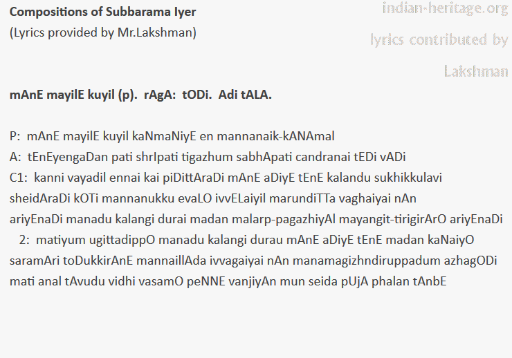 mAnE mayilE kuyil (p). rAgA: tODi. Adi tALA. Subbarama Iyer.