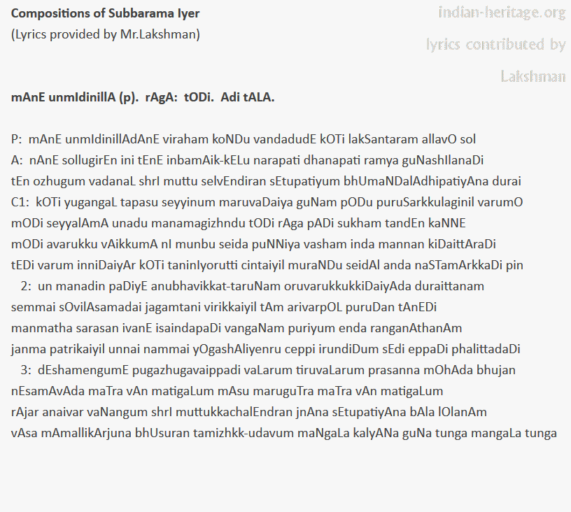 mAnE unmIdinillA (p). rAgA: tODi. Adi tALA. Subbarama Iyer.