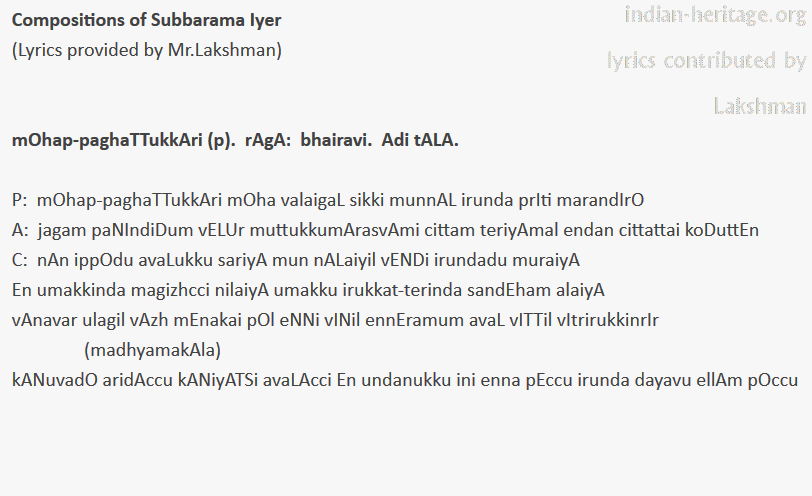 mOhap-paghaTTukkAri (p). rAgA: bhairavi. Adi tALA. Subbarama Iyer.