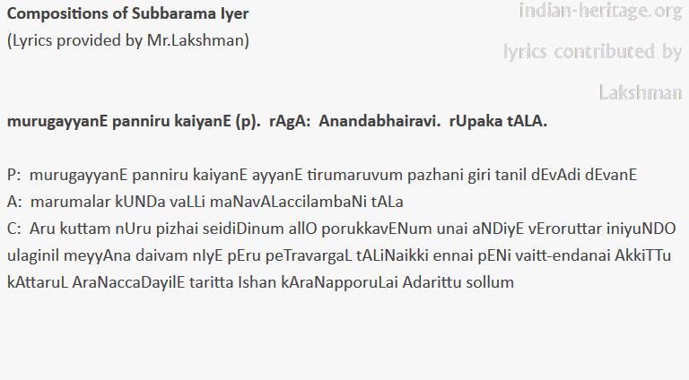 murugayyanE panniru kaiyanE (p). rAgA: Anandabhairavi. rUpaka tALA. Subbarama Iyer.