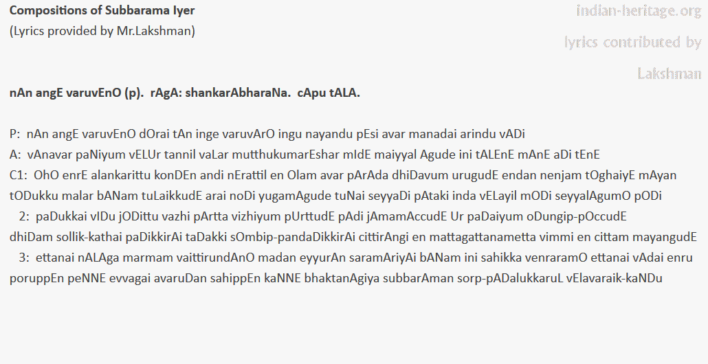 nAn angE varuvEnO (p). rAgA: shankarAbharaNa. cApu tALA. Subbarama Iyer.