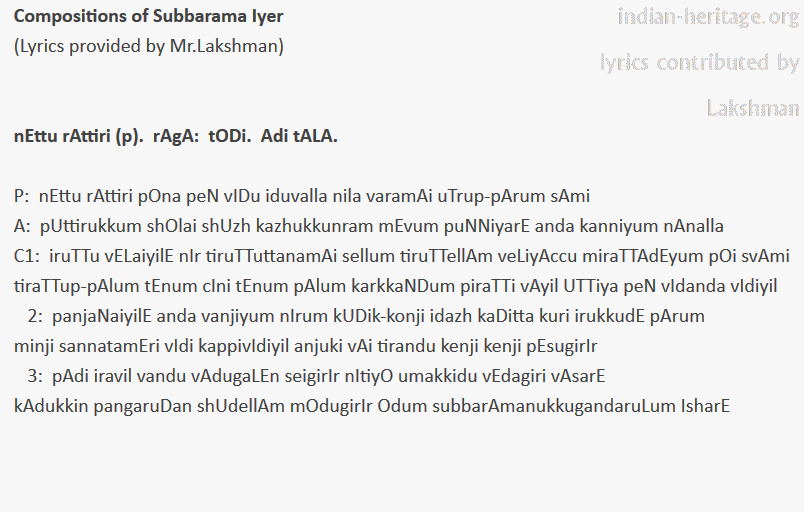 nEttu rAttiri (p). rAgA: tODi. Adi tALA. Subbarama Iyer.