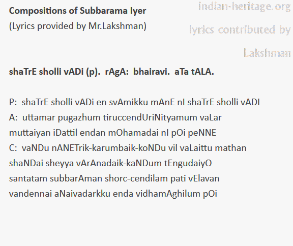 shaTrE sholli vADi (p). rAgA: bhairavi. aTa tALA. Subbarama Iyer.