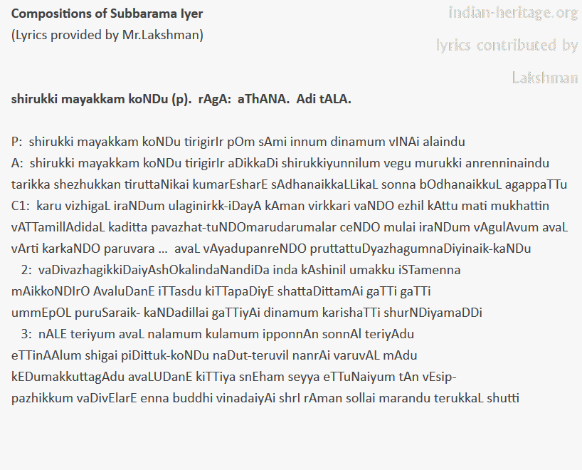 shirukki mayakkam koNDu (p). rAgA: aThANA. Adi tALA. Subbarama Iyer.