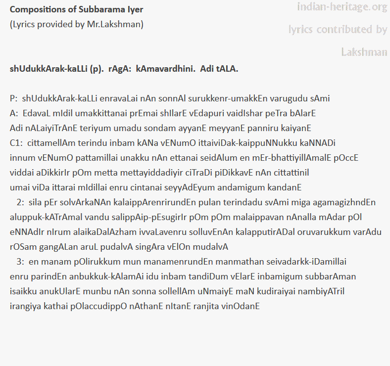 shUdukkArak-kaLLi (p). rAgA: kAmavardhini. Adi tALA. Subbarama Iyer.