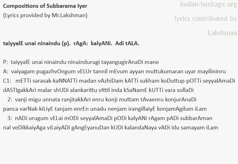 taiyyalE unai ninaindu (p). rAgA: kalyANi. Adi tALA. Subbarama Iyer.