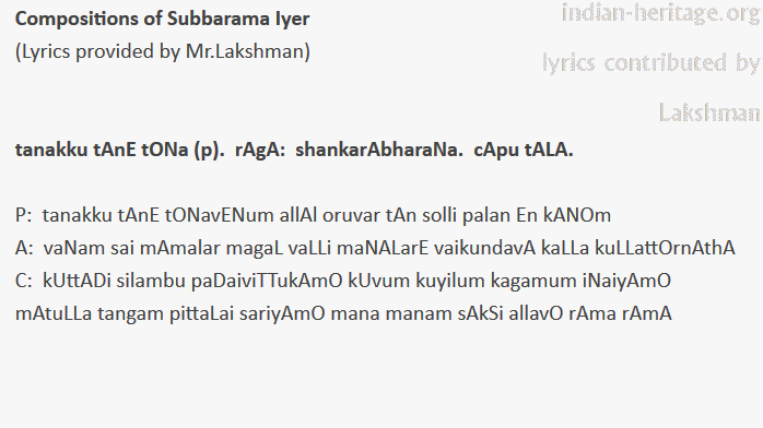 tanakku tAnE tONa (p). rAgA: shankarAbharaNa. cApu tALA. Subbarama Iyer.