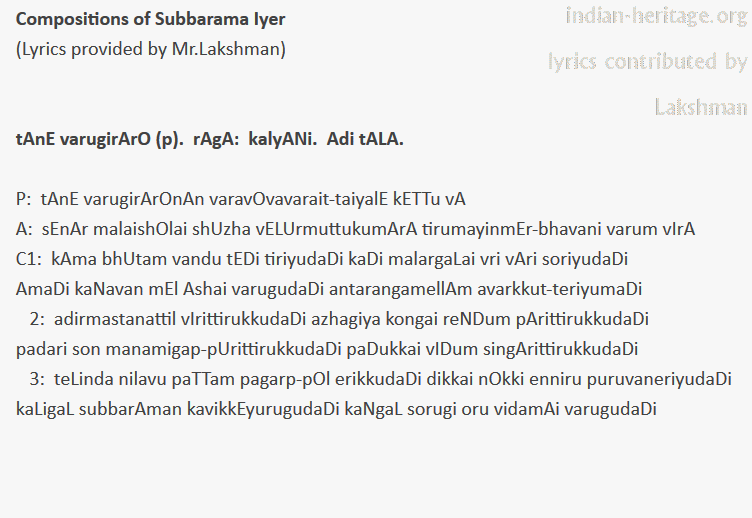tAnE varugirArO (p). rAgA: kalyANi. Adi tALA. Subbarama Iyer.
