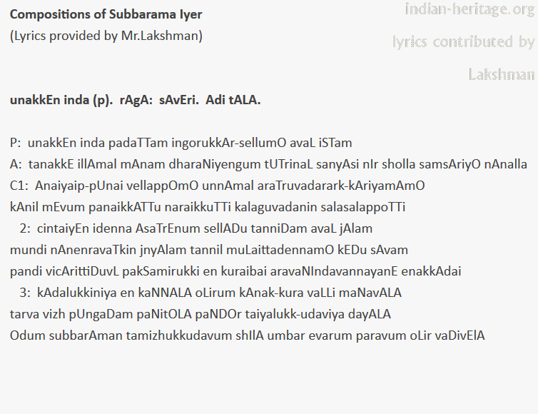 unakkEn inda (p). rAgA: sAvEri. Adi tALA. Subbarama Iyer.