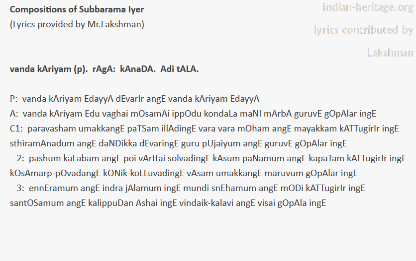 vanda kAriyam (p). rAgA: kAnaDA. Adi tALA. Subbarama Iyer.