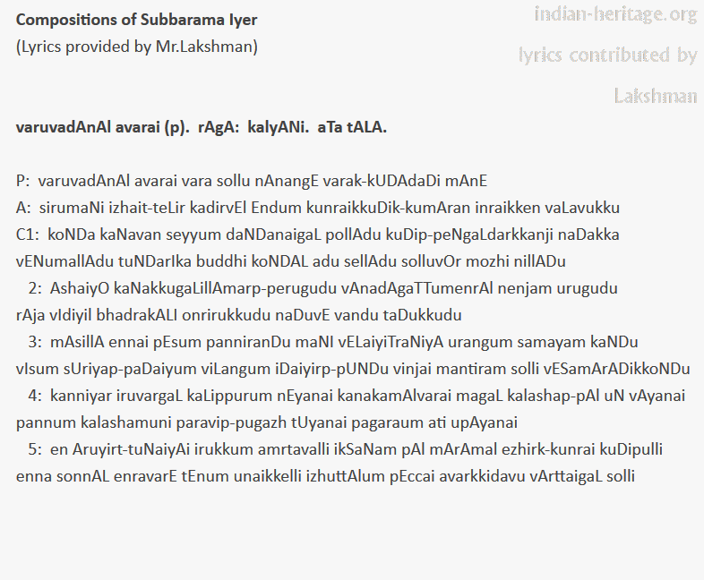 varuvadAnAl avarai (p). rAgA: kalyANi. aTa tALA. Subbarama Iyer.