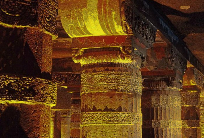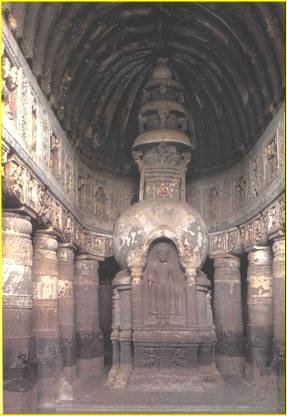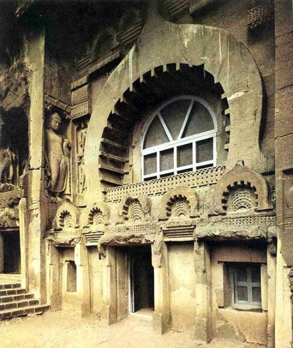 The entrance has a prominent arched window to light the interior. Relief sculptures added in Mahayana period