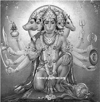 *  According to Hanumath Prakaranam in Sri Vidyarnavatantram, Anjaneya has five faces (Pancha Mukha) and ten weapons. The five faces are that of Hanuman, Narasimha, Adivaraha, Hayagriva, and Garuda. There is a belief that one of the faces is that of Sri Vinayaka.  He is a great yogi (mystic) having transcended the five senses (Pancha Indriyas).