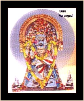 The sthlam of Guru Bhagavan is Alangudi, 17 kms from Kumbakonam enroute to Mannargudi. His wives are Tharai, Sangini. The presiding deities are Kasi Aaranyeswarar and his consort Elavarkuzhali. Guru is the Lord of Dhanusu and Meena Rasi and he faces North direction. The Adi Devatha is Brahma and the Prathyathi Devatha is Indran. His colour is yellow and his vahana is elephant. The grain associated with him is kadalai; the flower - white mullai; fabric - yellow cloth; gem - pushparagam (white topaz); food - rice mixed with bengal gram dhal powder.
