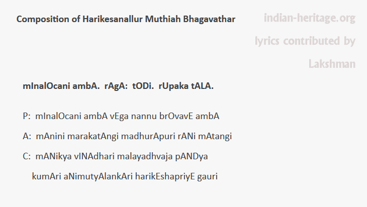 mInalOcani ambA. rAgA: tODi. rUpaka tAlA. - Composition of Harikesanallur Muthiah Bhagavathar