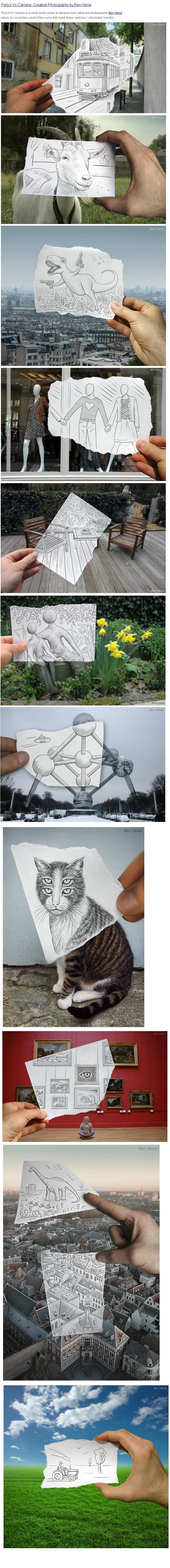 Pencil Vs Camera is a clever photo series by Belgium born artist and photographer Ben Heine where he completes a part of the scene with hand drawn sketches.