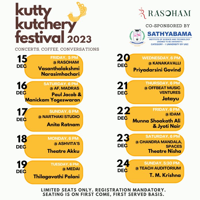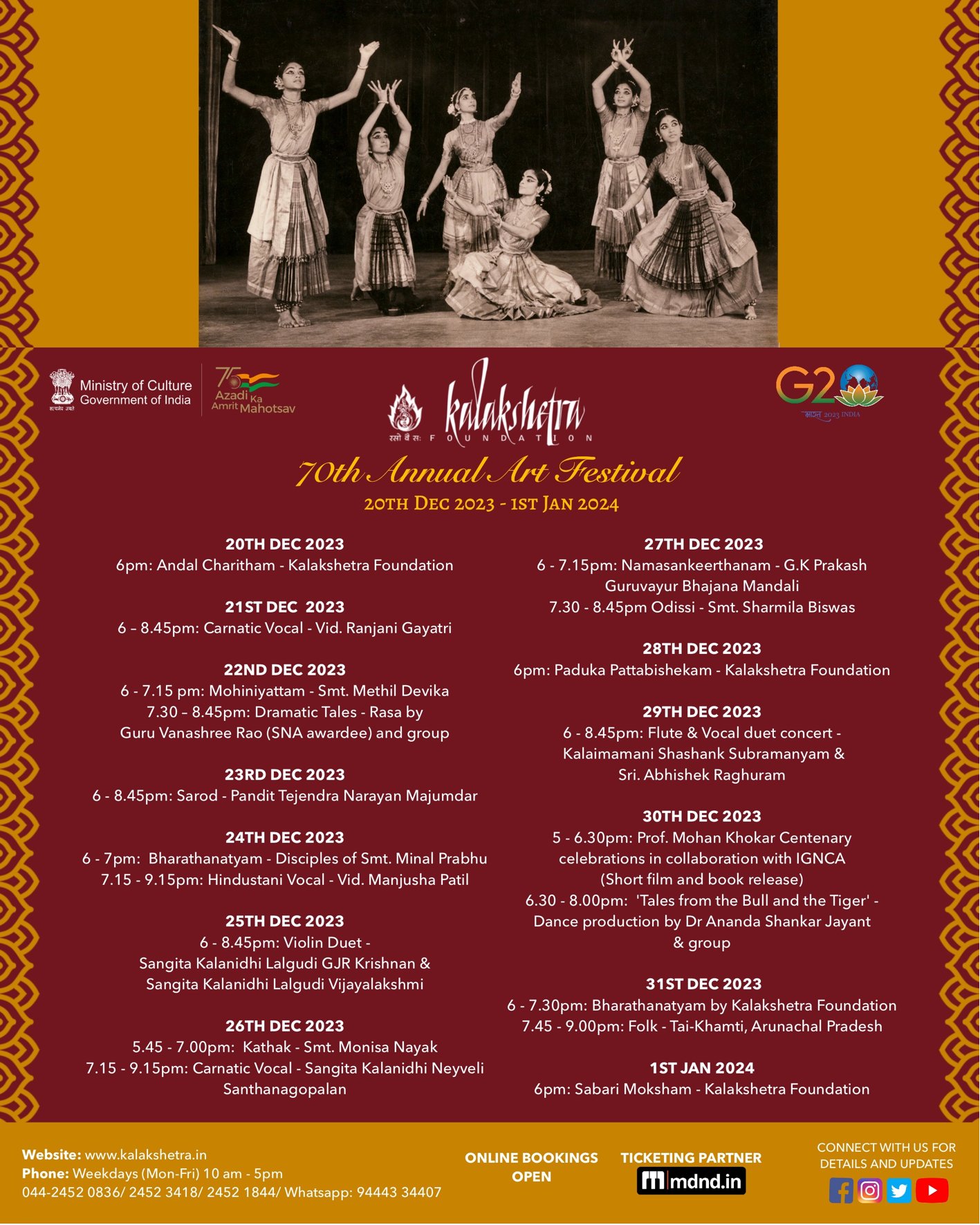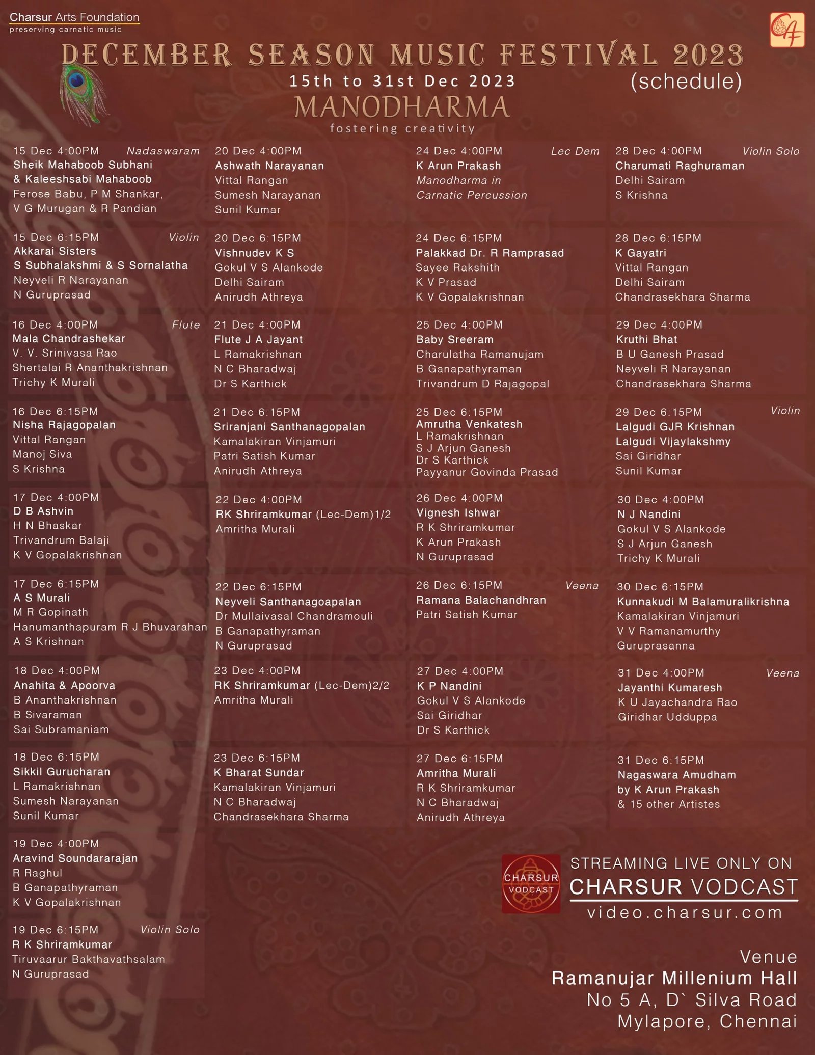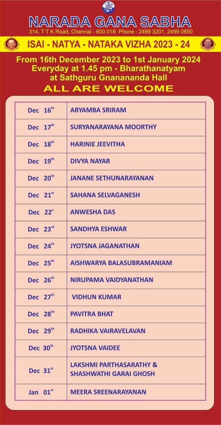 Presentations / Reviews * A lecture at the Music Academy to pay centenary tributes to two great nagaswaram artistes - Namagiripettai Krishnan and Vedaranyam Vedamoorthy by Vidvan Lalitha Ram on Dec 23rd, 2023, 8.05 a.m. watch on youtube.com * India's biggest annual dance conference: The Natya Kala Conference by Ashish Mohan Khokar | narthaki.com, January 6, 2024 read in narthaki.com * The 22nd edition of Natya Darshan conference and performances read in narthaki.com * Madras Music Academy Dance Festival - Time tested splendor of classicism by V. Kaladharan read in narthaki.com * Margazhi Shorts: Margazhi Medley by Chitra Mahesh | narthaki.com Part 1 | Part 2 * Chennai’s Carnatic musicians walk the ramp | The Hindu watch on youtube.com Carnatic Legends RampWalk, Unni Krishnan, Rajhesh Vaidhya Sudha Raghunathan at Marvellous Marghazhi | Galatta Tamil watch on youtube.com SCHEDULE 2023 - 2024 Bharat Kalachar 35th Margazhi Mahotsav (16 Dec 2023 - 15 Jan 2024) Schedule Venue: YGP Auditorium, TP Road, Chennai 600017 Info: 8248871089 Bharatiya Vidya Bhavan Bhavan's annual Margazhi Music Festival 2023 (24 Nov - 13 Dec 2023) In Association with South Zone Cultural Centre Venue: Bhavan's Pottipati Gnanamba Obul Reddy Auditorium, East Mada Street, Mylapore, Chennai Brahma Gana Sabha December Art Festival (7 Dec 2023 - 31 Jan 2024) Schedule Venues: TAG Dakshinamurthy Auditorium, RR Sabha, Mylapore, Chennai. Charsur Arts Foundation December Season Music Festival 2023- MANODHARMA (15 - 31 Dec 2023) Schedule Venue: Sri Ramanujar Millennium Hall, Mylapore, Chennai Info: +91 44 2498 7189 / info@charsurartsfoundation.org Kalakshetra 70th Annual Art Festival (Dec 20, 2023 - Jan 1, 2024) Schedule Kartik Fine Arts 49th year At Festival (1 Dec 2023 - 3 Jan 2024) Schedule Venues: Narada Gana Sabha Main Hall, Bharatiya Vidya Bhavan Main / Mini Halls 22nd Natya Darshan (15 - 17 Dec 2023) Schedule Venue: Bharatiya Vidya Bhavan, Chennai MadRasana Festival 2023 (22 - 26 Dec 2023) Schedule Venue: MS Subbulakshmi Arangam, Asian College of Journalism, Taramani Info: support@madrasana.com / Whatsapp Message Only - +918300938103 Naada Inbam Kedaram 8th Isai Vizha (1 - 3 Dec 2023, 4-6pm) December Music Festival 2023 (4 Dec 2023 - 4 Jan 2024) Schedule Venue: Raga Sudha Hall, 85/2, Luz Avenue, Mylapore, Chennai Info: 2499 2672 / naadainbam@gmail.com naadainbam.wordpress.com Narada Gana Sabha Isai Natya Nataka Vizha (16 Dec 2023 - 1 Jan 2024) Bharatanatyam artistes for the 1:45pm slot Schedule Venue: Sathguru Gnanananda Hall, Narada Gana Sabha, Chennai. Entry free. Rasa Arpita (Academy for the Research & Performance of Indian Theatre Arts) in collaboration with the Madras Lions Charitable Trust Kala Rasa Mahotsavam, the Annual Margazhi Festival (28 Dec, 2023 - 4 Jan, 2024) Schedule Venue: Bapalal Bhavan, Valmiki Nagar, Thiruvanmiyur, Chennai. The programs are open to all. Info: communications.rasaindia@gmail.com Rasoham Kutty Kutchery Festival 2023 (Dec 15 - 24, 2023) in 10 alternate and intimate venues across Chennai Schedule rasoham.org RR Sabha Annual December Festival 2023 (4 - 27 Dec 2023) Lec Dems (1 -3 Dec 2023) Schedule https://www.rrsabha.org/cevent.html (for awards) Sri Krishna Gana Sabha 67th Margazhi Mela (14 Dec 2023 - 3 Jan 2024) 41st Natya Kala Conference (26-30 Dec 2023) TRANSCENDENCE - Natya that traverses, transposes, transforms Schedule Venue: Nalli Gana Vihar, Krishna Gana Sabha, T.Nagar, Chennai Sri Parthasarathy Swami Sabha 123rd year Isai Vizha December Music Festival (15 Dec 2023 to 4 Jan 2024) Schedule Venue: Vidya bharathi, 55, bheemasena garden road, Mylapore, chennai Phone : 2499 7269 / 2499 1248 Sri Thyaga Brahma Gana Sabha 44th Isai, Iyal, Nataka Vizha (9 Dec 2023 - 15 Jan 2024) Venue: Vani Mahal, 103, GN Raod, TNagar,Chennai 17 34th Bharatham Festival (2 Jan 2024 - 2 Feb 2024) Venue: Sri.P.Obul Reddy Hall vanimahal.com The Music Academy 97th Annual Conference & Concerts (15 Dec 2023 - 1 Jan 2024) Schedule 17th Dance Festival 2024 (3 Jan 2024 - 9 Jan 2024) Schedule Info: +91-44-2811 2231 / +91-44-2811 5162 / music@musicacademymadras.com musicacademymadras.in Awards 2023 - 2024 Related sites chennaidecemberseason.com MDnD Entertainment Private Limited - Book your Season tickets mdnd.in/seasontickets |