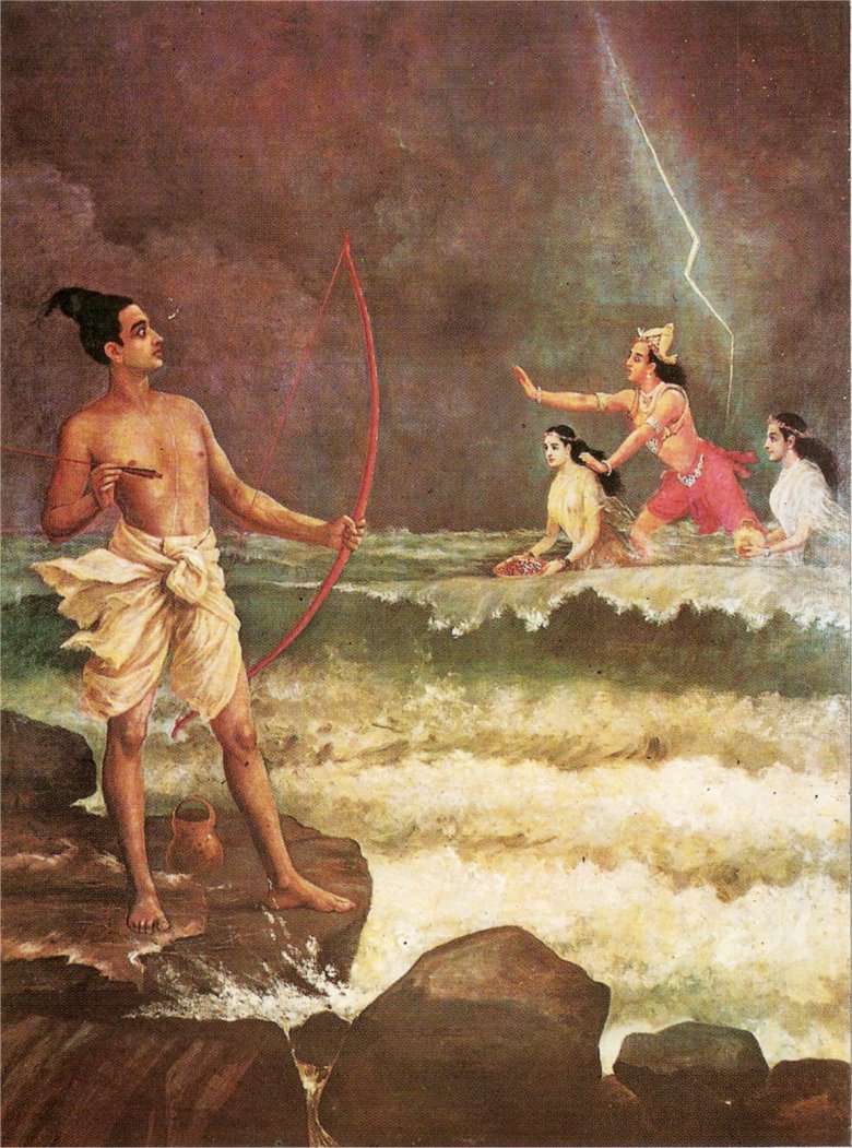 Varuna pacifying Rama's anger when the sea refused to give way to reach Lanka