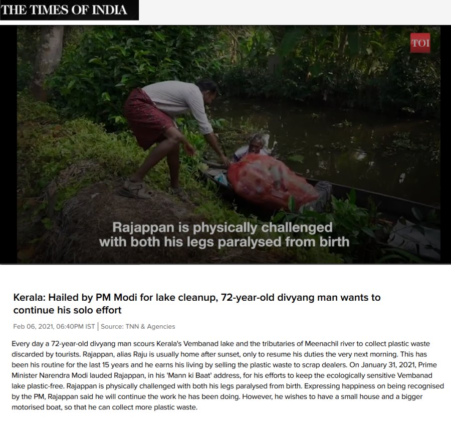Hailed by PM Modi for lake cleanup, 72 year old divyang man Rajappan wants to continue his solo effort