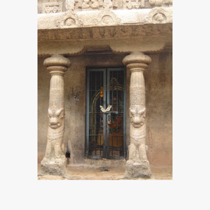 pillars (pilasters) with a seated lion as base, a cylindrical carved portion