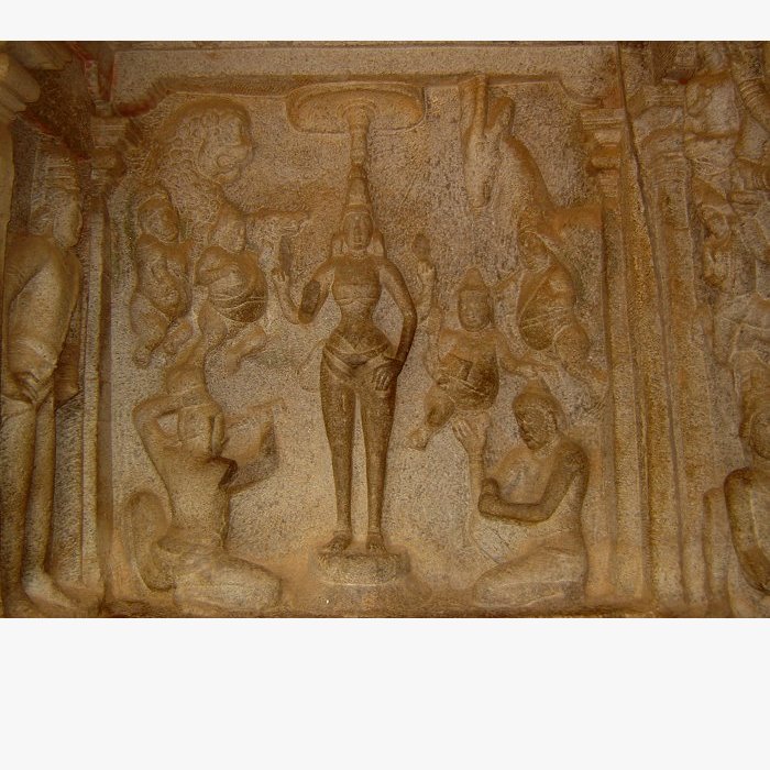 Lord Varaha, a gigantic figure holding aloft the tiny Boomidevi. Varaha